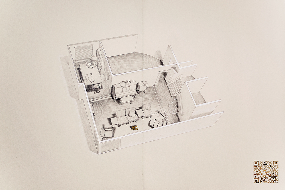 In The Living Room, I use Augmented Reality (AR) with drawing to invite the viewer into a more immersive interaction with the image. The aerial view drawing of a living room transforms into an immersion in the location itself. Visitors can stand virtually ‘in my shoes’ inside the drawing and look around from my point of view. The radio is playing, I invite you to stay a while.