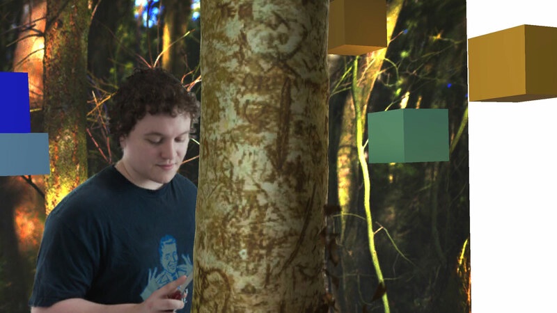 The installation The River Edge invites viewers to virtually explore the Nicomekl River shore in Surrey, BC . This is a location along the river where people experience a natural environment that is nevertheless shaped by human activity in a variety of ways. The scene captures the location at a moment where the sketchpad and drawing tools suggest a place of contemplation, but other activity can be seen through the virtual iPad in the scene – a glimpse of the river and the shore on the other side where kayakers go by as the train, an ubiquitous sight of industry in this area, passes by in the distance.