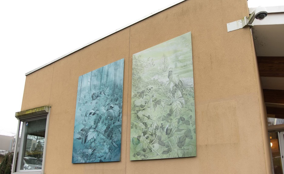 This two panel mural is part of the project to revitalize the Newton Area in Surrey. New construction to encourage the use of outdoor public spaces, includes a new Park and lake, the creation of new pathways connecting the public buildings in this area, and the renovation of existing outdoor areas. The Mural, installed February 2016, is located on the east facing wall of the Newton Senior Centre in close proximity to the Reservoir Lake, Library, and the Newton Arena. The final renovation of the green space will see the creation of an outdoor plaza with seating areas.